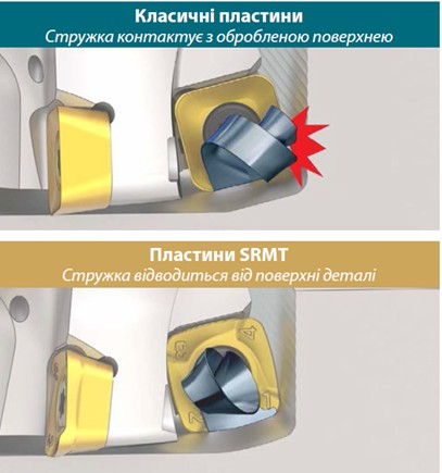 Окрему увагу в конструкції SRMT приділено контролю формування та відведенню стружки. Геометрія стружколому та канавок забезпечує стабільне переміщення стружки із зони різання, запобігаючи її контакту з обробленою поверхнею.